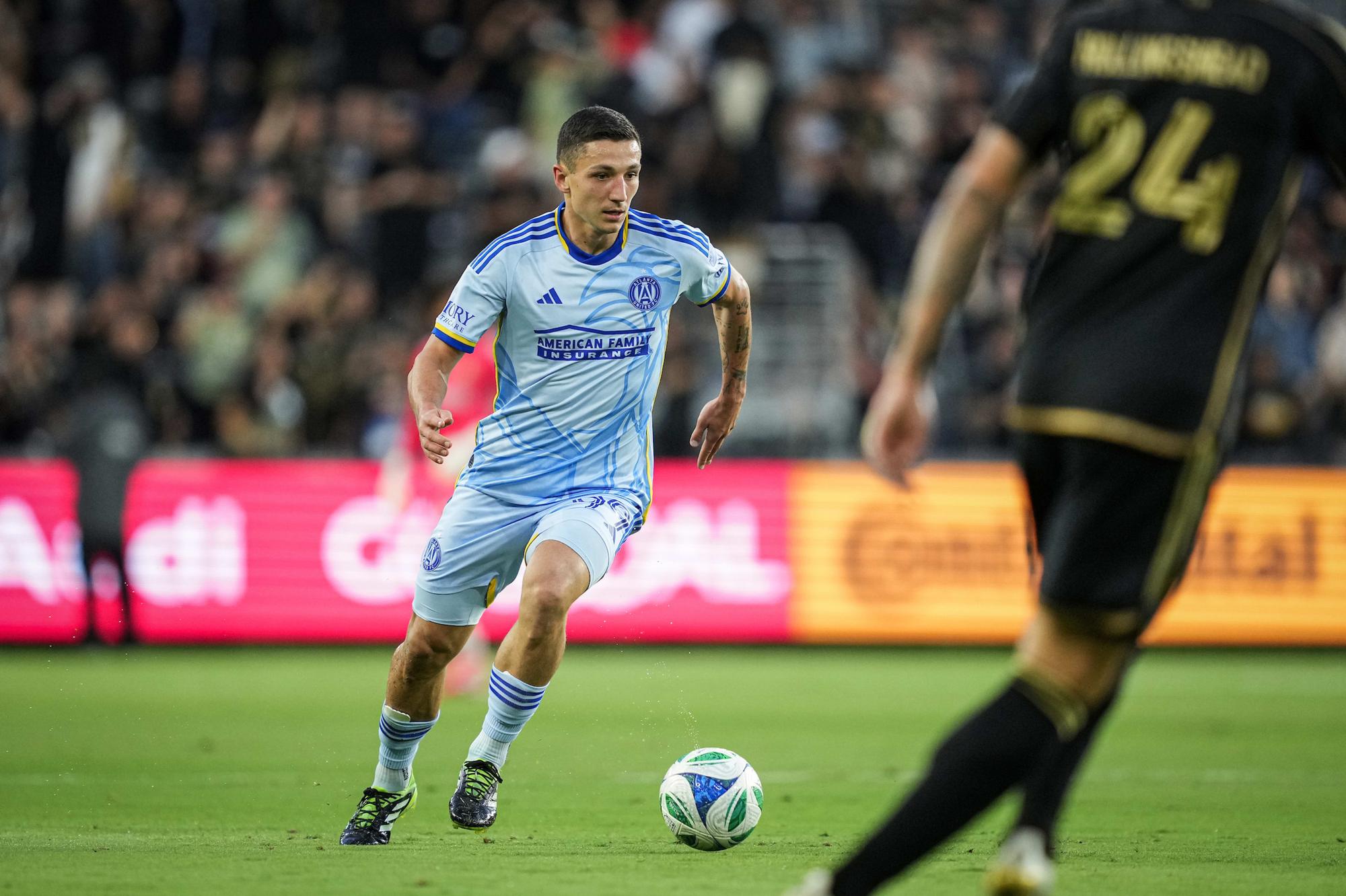 Bouanga tested the back line periodically, slipping behind in the 6th and 17th minutes, both times denied by Gregersen’s recovery and Hibbert’s saves. Palencia forced another fingertip stop in the 25th minute. Atlanta were seemingly coached to swarm the ball carrier, all defensive players attempting to prevent a runner from entering the box.