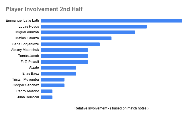 The pattern of involvement reflected what the eye test suggested. Almirón was central to nearly every dangerous Atlanta movement, while Jacob and Sanchez repeatedly drove play down the right side.